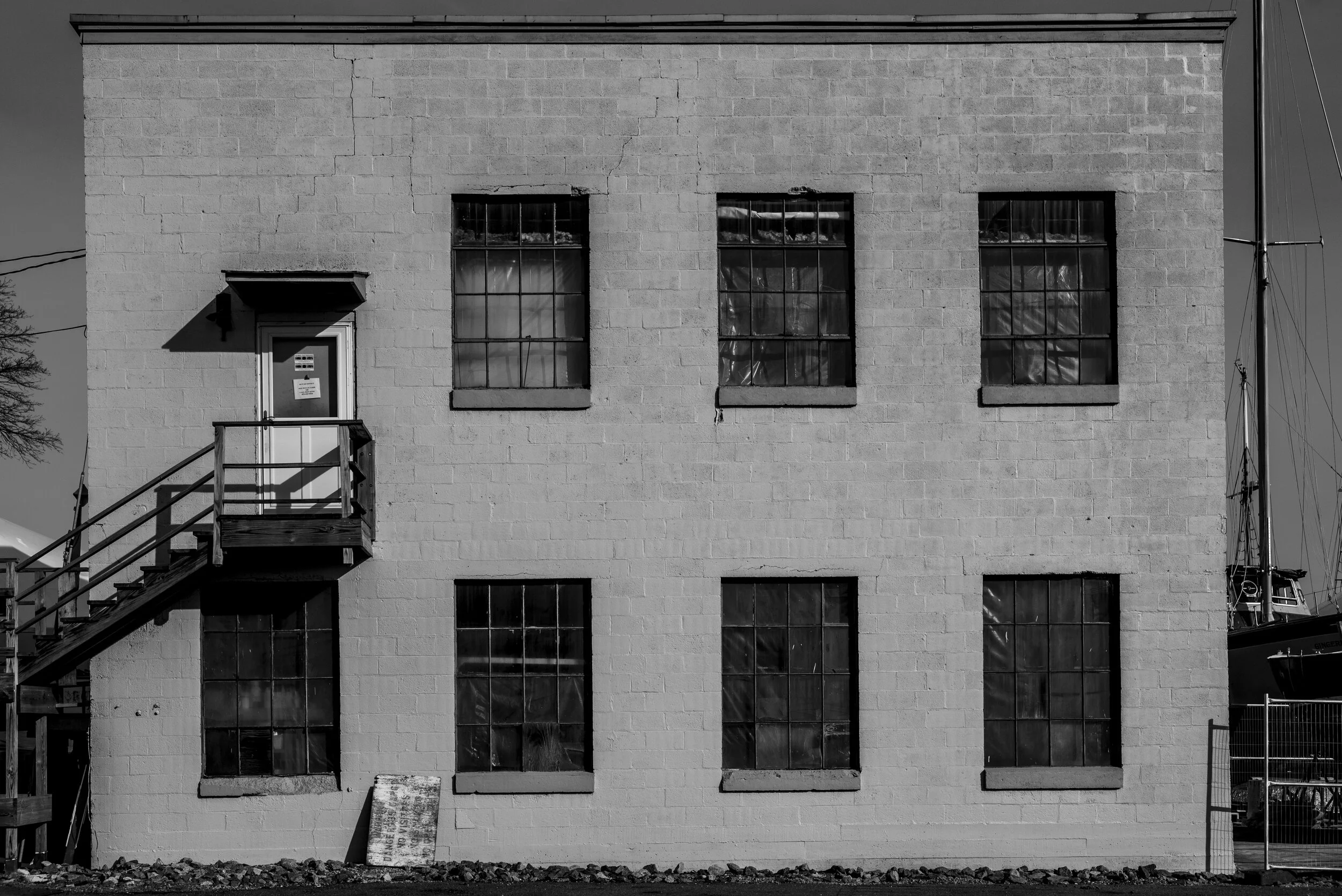 Yellow cleat against navy blue commercial fishing boat, Gloucester, MA